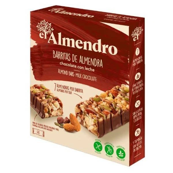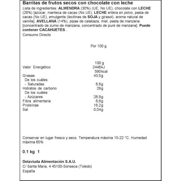 Ingredientes: almedra, chocolate con leche, leche entera en polvo, pasta de cacao, emulgente: lecitina de soja y girasol, avellana, pipas de calabaza, miel,pasta de manzana