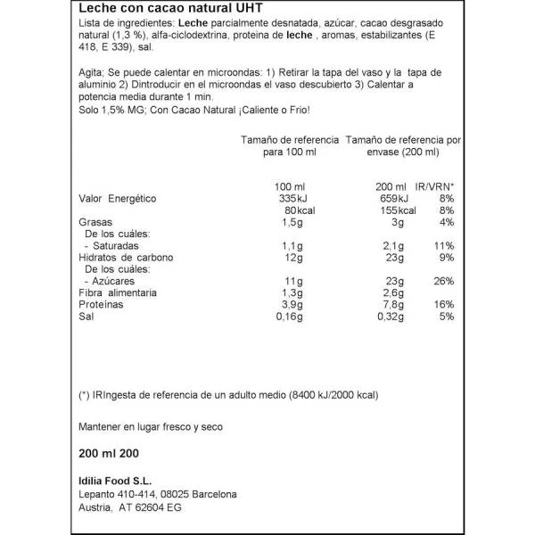 Leche parcialmente desnatada, azúcar, cacao desgrasado natural (1,3 %), alfa-ciclodextrina, proteina de leche, aromas, estabilizantes (E418, E339), sal.