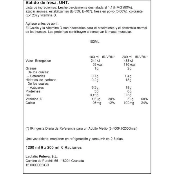 Leche parcialmente desnatada al 1,1% M.G. (90%), azúcar, aromas, estabilizantes (E339, E407), fresa en polvo (0,06%), colorante (E120), vitamina D.