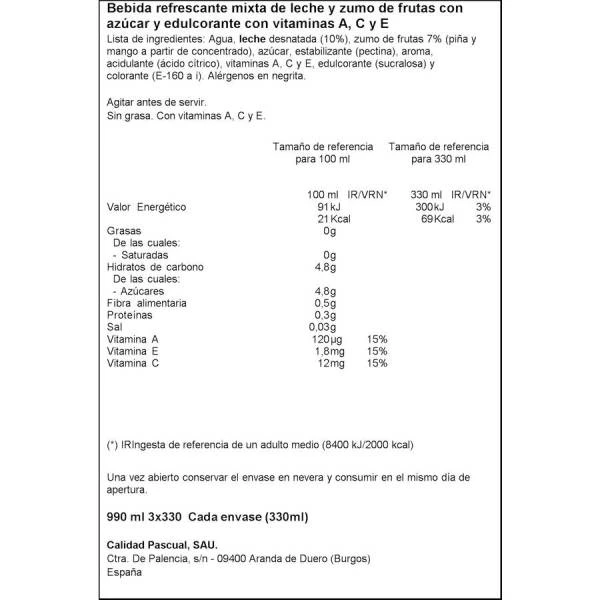 Agua, leche desnatada (10%), zumo de frutas 7% (piña y mango a partir de concentrado), azúcar, estabilizante (pectina), aroma, acidulante (ácido cítrico), vitaminas A, C y E, edulcorante (sucralosa) y colorante (E160ai).