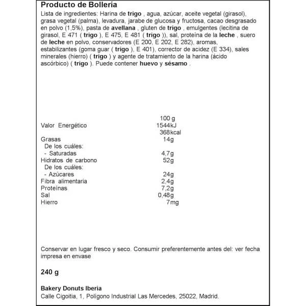Harina de trigo, agua, azúcar, aceite vegetal (girasol), levadura, jarabe de glucosa y fructosa, cacao desgrasado en polvo (2,1%), pasta de avellana, manteca de cacao, gluten de trigo, emulgentes (lecitina de girasol, E 471), proteína de la leche, suero de leche en polvo, sal, conservadores (E 200, E 202, E 282), sales minerales (sacarato férrico), aromas, corrector de acidez (E 334), colorante (E 171), agente de tratamiento de la harina (E 300). Puede contener huevo y/o semillas de sésamo.