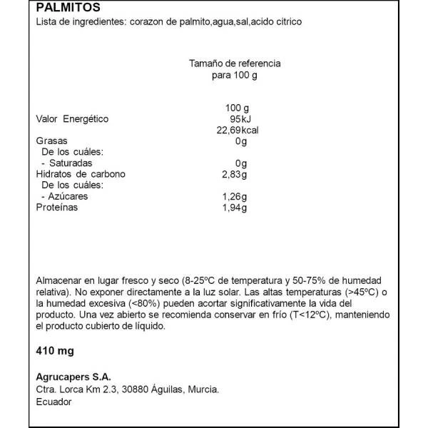 Corazones de palmito, agua, sal y ácido cítrico E-330.