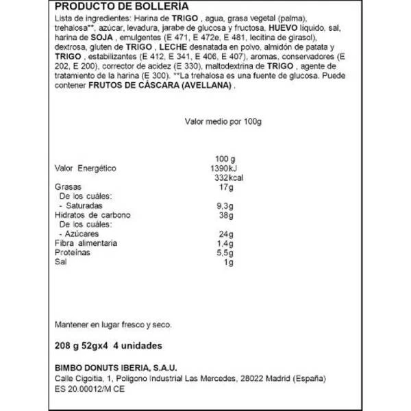 Harina de trigo, agua, grasa vegetal de palma, trehalosa, azúcar, levadura, jarabe de glucosa y fructosa, huevo líquido, sal, harina de soja, emulgentes (E 471, E 472e, E481, lecitina de girasol), dextrosa, gluten de trigo, leche desnatada en polvo, almidón de patata y trigo, estabilizantes (E412, E341, E406, E407), aromas, conservadores (E 202, E200), corrector de la acidez (E330), agente de tratamiento de la harina (E 300). La trehalasa es una funte d glucosa. Puede contener frutos de cáscara (avellana).