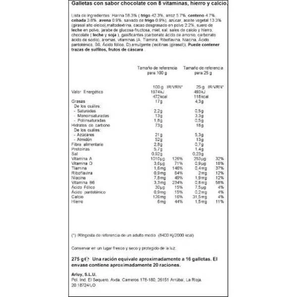 Harina58,3% (trigo 42,3%, arroz 5,7%, centeno 4,7%, cebada 3,8%, avena 0,9%, salvado de trigo 0,9%), azúcar, aceite vegetal 13,3% (girasol alto oleico), maltodextrina, cacao desgrasado en polvo 2,2%, suero de leche en polvo, jarabe de glucosa-fructosa, miel, sal, sales de calcio y hierro, chocolate (leche,soja), gasificantes (carbonato ácido de amonio, carbonato ácido de sodio), aromas, vitaminas (A, tiamina, riboflavina, niacina, ácido pantoténico, B6, acido fólico, D) emulgente (lecitinas (girasol). Puede contener trazas de sulfitos, frutos de cáscara.