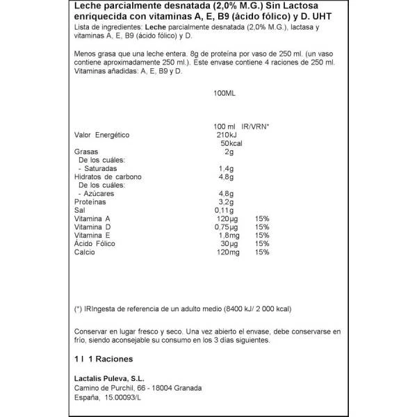Leche parcialmente desnatada (2% M.G.), lactasa, vitaminas A, E, B9 (ácido fólico) y D.