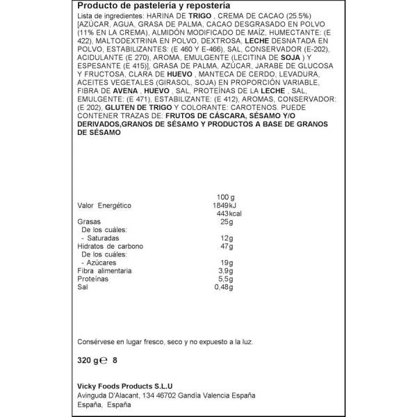 Harina de trigo, crema de cacao (25,5%) [azúcar, aceite de palma, agua, cacao desgrasado en polvo (11%), dextrosa, almidón modificado de maíz, maltodrextina, humectante: glicerina, leche desnatada en polvo, estabilizantes: E-460 y E-466, sal, conservador: E202, emulgente: lecitina de soja, aroma, coloranre: E-170, acidulante: E-270 y espesante: goma xantana], aceites y grasas vegetales (palma, girasol, soja) en proporción variable, azúcar, jarabe de glucosa y fructosa, clara de huevo, manteca de cerdo, levadura, fribra de avena, huevo, proteina de la leche, sal, emulgente: mono y diglicéridos de ácidos grasos, estabilizante: goma guar, aroma, conservador: E-202, gluten de trigo, agente de tratamiento de la harina: ácido ascórbico y colorante: caroteno. Puede contener trazas de frutos de cáscara, sésamo y/o productos derivados.