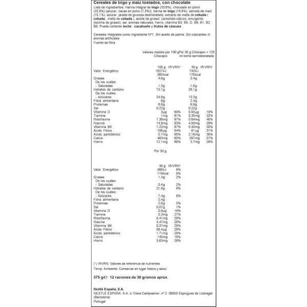 Cereales (61,9%) (harina integral de trigo (31,8%), harina de trigo, sémola de maíz), chocolate en polvo (22,2%) (azúcar, cacao), azúcar, jarabe de glucosa, extracto de malta de cebada, grasa de palma, emulgente (lecitina de girasol), sal, aromas (vainilla, canela), vitaminas (D, tiamina, riboflavina, niacina, B6, ácido fólico, ácido pantoténico), carbonato cálcico, hierro. Puede contener trazas de leche, cacahuete y frutos secos.