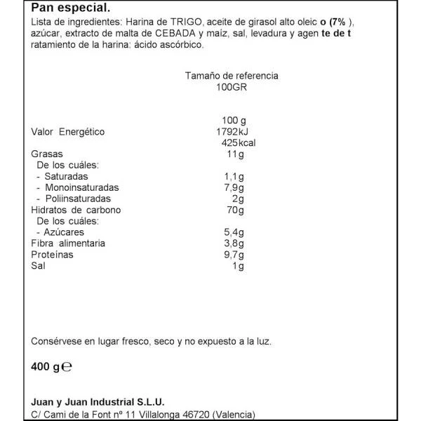 Harina de trigo, aceite de girasol alto oleico (7%), azúcar, extracto de malta de cebada y maíz, sal y levadura y agente de tratamiento de la harina: ácido ascórbico.