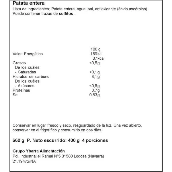 Patata entera, agua, sal, antioxidante (ácido ascórbico). Puede contener dióxido de azufre y sulfitos.