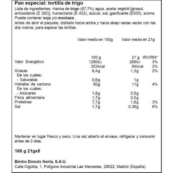 Harina de trigo (67,7%), agua, aceite vegetal [girasol, antioxidante (E 392)], humectante (E 422), azúcar, sal, gasificanate (E 500), aroma. Puede contener soja y/o mostaza.
